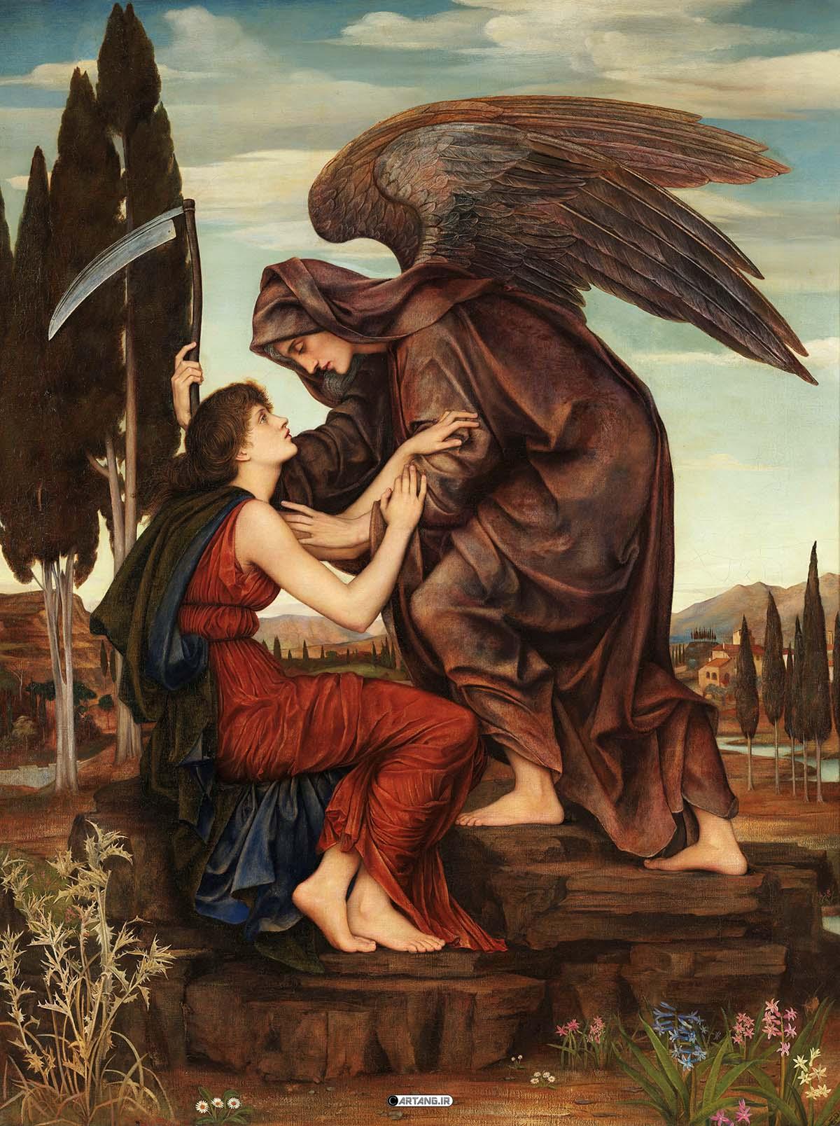 نقاشی فرشتۀ مرگ اثری است با بنمایههای اساطیری که ویژگیهای فنی سبک نقاشیهای کلاسیک ایتالیایی را در خود جای داده است. موضوع مرگ موضوعی است که به طور فزایندهای در اوایل عصر اولن دا مورگین (نقاش این اثر) به چشم میخورد. فرشتۀ مرگ، آشکارترین موضوع نمایشی این نقاشی است و نشانگر اعتقاد روحانی اولن میباشد که نشان میدهد مرگ فرایندی است که باید از آن استقبال شود و نباید از آن ترسید یا به دیدۀ وحشت به آن نگریست. اولن در این تابلوی زیبا فرشتۀ مرگ را به گونهای به تصویر میکشد که با موهای خاکستری خود و چهرهای آرام با بالهای باشکوه و اساطیری تبدیل به یک سمبل شده است. او با داشتن یک چهرۀ زیبا و خوشریخت، به آرامی چهرۀ زن ضعیف و نگرانی را که در نگاهش خیره شده است را تسکین میبخشد. به نظر میرسد زن جوانِ در آستانۀ مرگ، زندگی سختی داشته است و نشانۀ این زندگی دشوار چشماندازی از خشکی پشت سرش است. منظرۀ پشت سر زن در حال مرگ، نمایی آسیب دیده و خشک را نشان میدهد اما در مقابل، راه رو به جلو با منظرۀ حاصلخیز و گلهای بهاری نشان داده شده است. این زیبایی پیش رو نشانگر دیدگاه اولن دربارۀ مرگ است که با زبانی رسا میخواهد بگوید که نباید از لحظۀ مرگ و مسیر بعد از مرگ ترسید، زیرا آنچه که در انتظار ماست، فقط زیبایی است و بس!